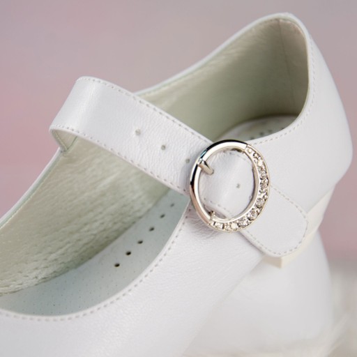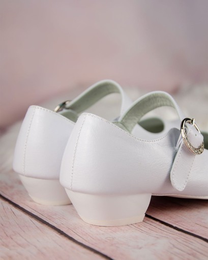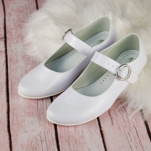Eleganckie białe buty komunijne dla dziewczynki. Buciki dobrze wyprofilowane, dzięki czemu są bardzo wygodne. Dodatkowo posiadają paseczek z przodu dla lepszego utrzymania stopy. Model na delikatnym obcasiku o wysokości 2,5 cm, w kolorze białym. Gładki model, który będzie pasował do każdej sukienki oraz alby. Zewnętrzna część obuwia wykonana jest ze skóry ekologicznej, natomiast wkładka ze skóry naturalnej. Klasyczne baleriny idealnie sprawdzą się zarówno w dniu Pierwszej Komunii Świętej jak i w podczas innych uroczystości.