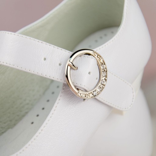Eleganckie białe buty komunijne dla dziewczynki. Buciki dobrze wyprofilowane, dzięki czemu są bardzo wygodne. Dodatkowo posiadają paseczek z przodu dla lepszego utrzymania stopy. Model na delikatnym obcasiku o wysokości 2,5 cm, w kolorze białym. Uroku dodaje im kokarda na przodzie cholewki. Zewnętrzna część obuwia wykonana jest ze skóry ekologicznej, natomiast wkładka ze skóry naturalnej. Klasyczne baleriny idealnie sprawdzą się zarówno w dniu Pierwszej Komunii Świętej jak i w podczas innych uroczystości.