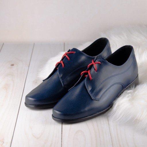 Klasyczne, granatowe buty komunijne dla chłopca. Buciki dobrze wyprofilowane, dzięki czemu są bardzo wygodne. Elegancki model, któremu uroku dodają czerwone sznurówki. W zestawie również sznurówki w kolorze granatowym. Zewnątrz obuwie wykonane z miękkiej licowej skórki ekologicznej, natomiast wkładka ze skóry naturalnej.