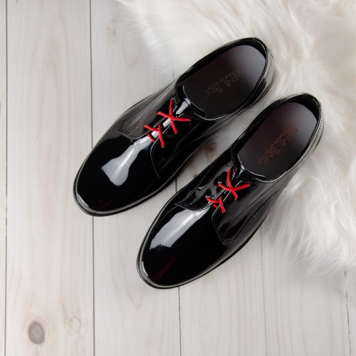 Klasyczne, lakierowane buty komunijne dla chłopca w kolorze czarnym. Buciki dobrze wyprofilowane, dzięki czemu są bardzo wygodne. Elegancki model, któremu uroku dodają czerwone sznurówki. W zestawie również sznurówki w kolorze czarnym. Zewnątrz obuwie wykonane z lakierowanej skórki ekologicznej, natomiast wkładka ze skóry naturalnej.