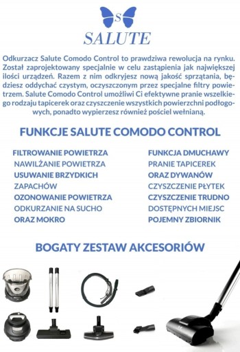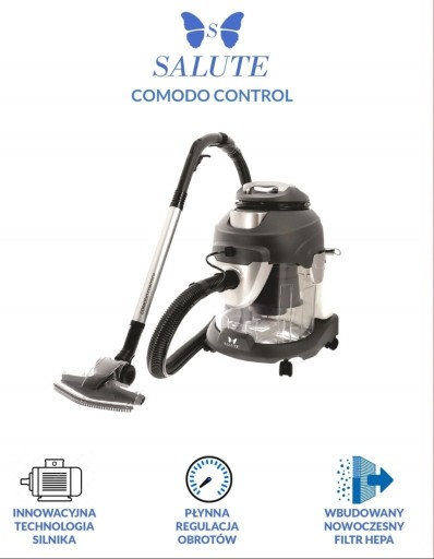 Odkurzacz Salute Comodo Control to prawdziwa rewolucja na rynku. Został zaprojektowany specjalnie w celu zastąpienia jak największej ilości urządzeń. Razem z nim odkryjesz nową jakość sprzątania, będziesz oddychać czystym, oczyszczonym przez specjalne filtry powietrzem. Salute Comodo Control umożliwi Ci efektywne pranie wszelkiego rodzaju tapicerek oraz czyszczenie wszystkich powierzchni podłogowych, ponadto wypierzesz również pościel wełnianą.