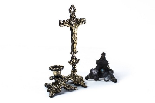 Nowy, ozdobny zestaw kolędowy krzyż + świeczniki mosiądz