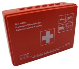 Podstawowy model apteczki w plastikowym pudełku.