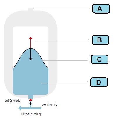 Poduszka gazowa utrzymuje ciśnienie wody w instalacji w określonych granicach. Podczas nagrzewania ciśnienie wzrasta, w wyniku czego woda z instalacji napływa do przestrzeni wodnej. Membrana odkształca się sprężając gaz i powodując wzrost ciśnienia. Z kolei podczas ochłodzenia objętość wody w instalacji zmniejsza się i tym samym spada ciśnienie. W naczyniu wzbiorczym woda wypływa ponownie z przestrzeni wodnej do instalacji. Membrana odkształca się rozprężając gaz i powodując spadek ciśnienia.
