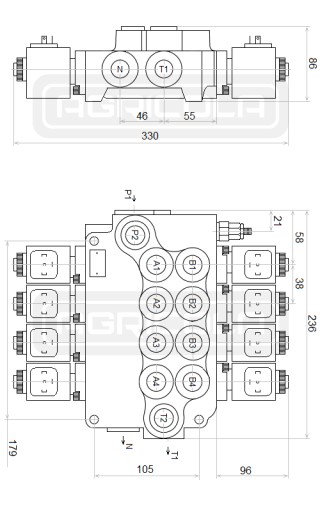 Z prawej strony schemat hydrauliczny rozdzielacza: