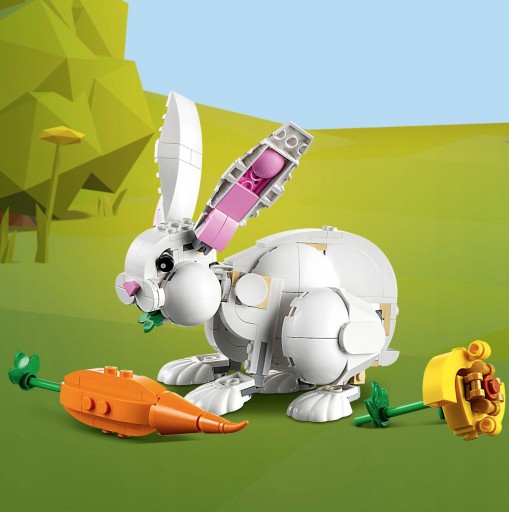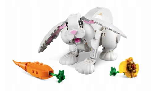 Dzięki zestawowi LEGO Creator 3 w 1 Biały królik (31133) dzieci w wieku od ośmiu lat mogą odgrywać zabawne historie. Zawiera on króliczka zbudowanego z klocków z ruchomą głową, nogami, pyszczkiem i uszami. Dla zwierzaka przygotowano także dwa przysmaki: marchewkę lub kwiatka.