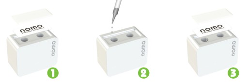 - Wlej po kilka kropel tuszu NOMO-INK do obydwu otworów (użycie innego tuszu grozi zniszczeniem pieczątki)