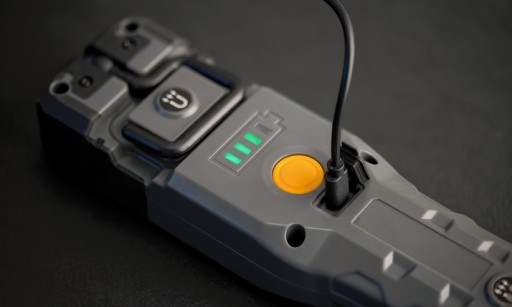 - Niezwykle wytrzymała latarka taktyczna ze zintegrowanym akumulatorem litowo-jonowym (3,7 V / 4,4 Ah) ze wskaźnikiem stanu i naładowania zapewnia maksymalną wydajność świetlną i czas świecenia do 24 godzin.