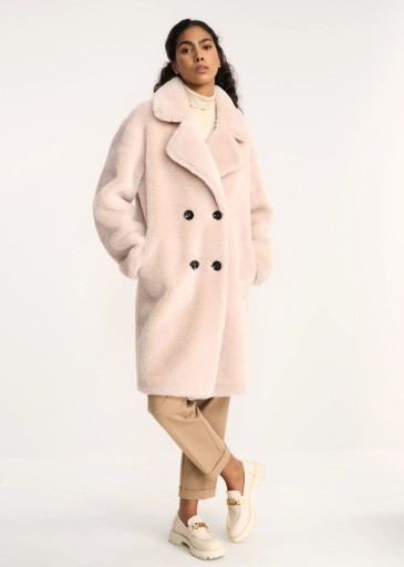 Futro damskie wykonane z wełny, Model w kolorze beżowym ma uniwersalny krój, modny każdego roku. Dzięki temu daje się łatwo zestawiać z innymi elementami garderoby. Idealnie spisze się w zimowe dni.