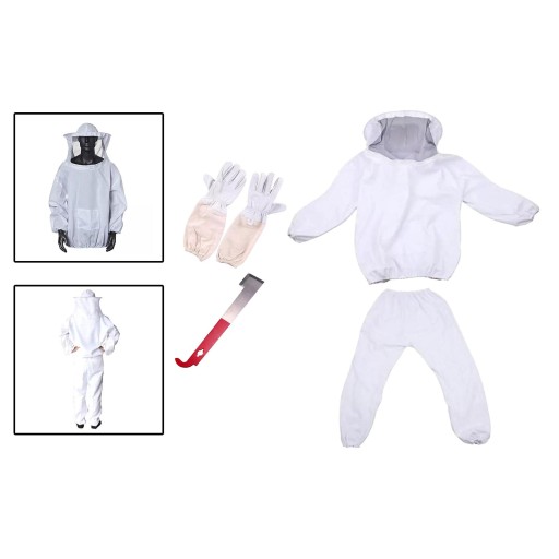 Pakiet obejmujący: 1 kombinezon pszczelarski (kurtka i spodnie) + 1 para rękawic pszczelarskich + 1 narzędzie do ula (hak J)