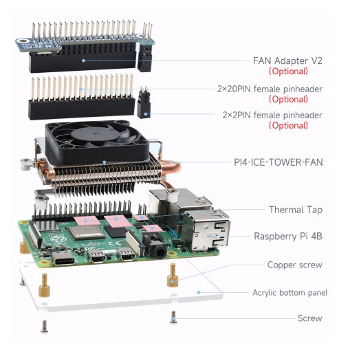 Dodatkowe informacje, instrukcja montażu, oprogramowanie itp, na stronie : https://www.waveshare.com/wiki/PI4-ICE-TOWER-FAN