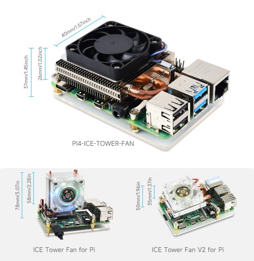 Ten bardzo wydajny radiator powstał w celu rozwiązania problemów odprowadzania ciepła z Raspberry Pi. Konstrukcja wieży chłodzącej zawiera 5mm rurki miedziane, wielowarstwowy radiator aluminiowy oraz wentylator. Konstrukcja ta pozwala znacznie obniżyć temperaturę procesora. Dzięki temu chłodzeniu malina może osiągnąć maksymalne swoje parametry. Wentylator posiada sterowanie PWM, dzięki czemu można programowo kontrolować jego prędkość obrotową.