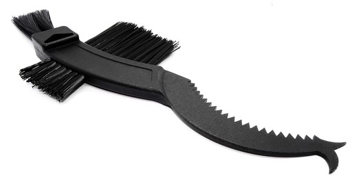 Grzebień z ząbkami wkładamy bezpośrednio pomiędzy zębatki wielotrybu, przy pomocy szczotek czyścimy dokładnie całą kasetę i łańcuch. Szczotką można czyścić przerzutki, korbowód i inne trudno dostępne miejsca w twoim rowerze.