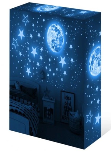 Niesamowite naklejki na przedpokój czy do pokoju dla dziecka. Wyglądają świetnie gdy jest jasno, lecz najlepszy efekt widać podczas ciemności. Gwiazdy i księżyc świecą na zielono, dodając pomieszczeniu niezwykłego klimatu. Naklejki świetnie sprawdzą się przy ozdobie pokoju twojego dziecka.