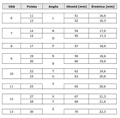USA 11 średnica wewnętrzna 20,50 mm obwód wewnętrzny 65 mm PL 25