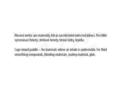 - verwendung: Der Käfigbesen wird für Materialien verwendet, bei denen eine Belüftung der Mischung unerwünscht ist - für dünne Spachtelmassen, Dichtstoffe, Klebstoffe für YTONG usw.