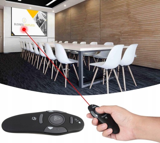 Czerwony laser pozwoli ci na swobodne wskazywanie najważniejszych elementów prezentacji maksymalnej odległości 200 metrów.Przyciski umożliwiają zmianę slajdów w przód i tył, wygaszenie ekranu czy wyłączenie urządzenia. Urządzenie ma zasięg do 15 metrów.