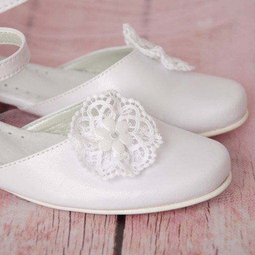 Eleganckie białe buty komunijne dla dziewczynki. Fason z zapiętkiem i regulowanym paseczkiem. Buciki dobrze wyprofilowane, dzięki czemu są bardzo wygodne. Model na delikatnym obcasiku o wysokości 2,5 cm, w kolorze białym. Uroku dodaje im biały kwiat. Klasyczny model, który będzie pasował do większości sukienek lub alb. Zewnętrzna część obuwia wykonana jest ze skóry ekologicznej, natomiast zapiętek i wkładka ze skóry naturalnej.