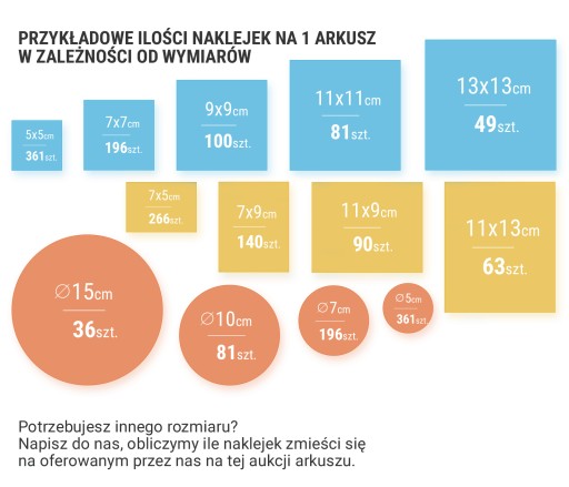 Zamów ilość pakietów odpowiadający Twoim potrzebom np. jeżeli potrzebujesz 100 naklejek okrągłych fi 150 mm, to zamów 3 pakiety (finalnie otrzymasz 108 naklejek).
