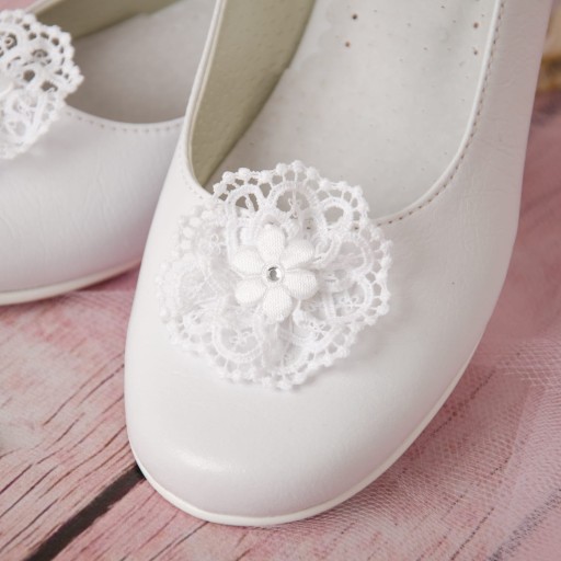 Eleganckie, wsuwane białe buty komunijne dla dziewczynki. Buciki dobrze wyprofilowane, dzięki czemu pewnie trzymają się stopy. Dodatkowo posiadają paseczek, którego można użyć z przodu dla lepszego utrzymania stopy lub z tyłu jako ozdobę. Model na delikatnym obcasiku o wysokości 1,5 cm, w kolorze srebrnym. Uroku dodaje im piękny kwiat. Zewnętrzna część obuwia wykonana jest ze skóry ekologicznej, natomiast wkładka ze skóry naturalnej. Klasyczne baleriny idealnie sprawdzą się zarówno w dniu Pierwszej Komunii Świętej jak i w podczas innych uroczystości i nie tylko.