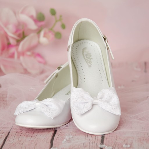 Eleganckie, wsuwane białe buty komunijne dla dziewczynki. Buciki dobrze wyprofilowane, dzięki czemu pewnie trzymają się stopy. Dodatkowo posiadają paseczek, którego można użyć z przodu dla lepszego utrzymania stopy lub z tyłu jako ozdobę. Model na delikatnym obcasiku o wysokości 1,5 cm, w kolorze srebrnym. Uroku dodaje im piękna kokarda. Zewnętrzna część obuwia wykonana jest ze skóry ekologicznej, natomiast wkładka ze skóry naturalnej. Klasyczne baleriny idealnie sprawdzą się zarówno w dniu Pierwszej Komunii Świętej jak i w podczas innych uroczystości i nie tylko.