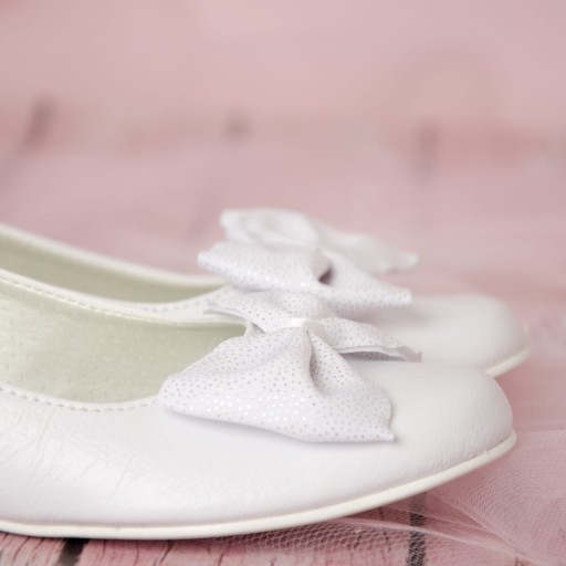 Eleganckie, wsuwane białe buty komunijne dla dziewczynki. Buciki dobrze wyprofilowane, dzięki czemu pewnie trzymają się stopy. Dodatkowo posiadają paseczek, którego można użyć z przodu dla lepszego utrzymania stopy lub z tyłu jako ozdobę. Model na delikatnym obcasiku o wysokości 1,5 cm, w kolorze srebrnym. Uroku dodaje im piękna kokarda. Zewnętrzna część obuwia wykonana jest ze skóry ekologicznej, natomiast wkładka ze skóry naturalnej. Klasyczne baleriny idealnie sprawdzą się zarówno w dniu Pierwszej Komunii Świętej jak i w podczas innych uroczystości i nie tylko.