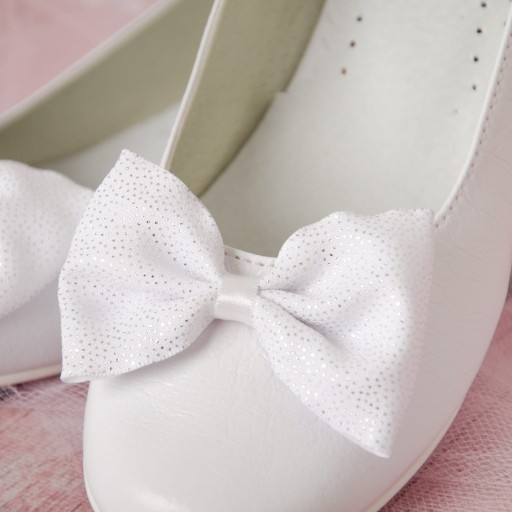 Eleganckie, wsuwane białe buty komunijne dla dziewczynki. Buciki dobrze wyprofilowane, dzięki czemu pewnie trzymają się stopy. Dodatkowo posiadają paseczek, którego można użyć z przodu dla lepszego utrzymania stopy lub z tyłu jako ozdobę. Model na delikatnym obcasiku o wysokości 1,5 cm, w kolorze srebrnym. Uroku dodaje im piękna kokarda. Zewnętrzna część obuwia wykonana jest ze skóry ekologicznej, natomiast wkładka ze skóry naturalnej. Klasyczne baleriny idealnie sprawdzą się zarówno w dniu Pierwszej Komunii Świętej jak i w podczas innych uroczystości i nie tylko.