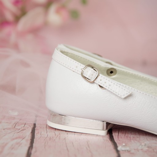Eleganckie, wsuwane białe buty komunijne dla dziewczynki. Buciki dobrze wyprofilowane, dzięki czemu pewnie trzymają się stopy. Dodatkowo posiadają paseczek, którego można użyć z przodu dla lepszego utrzymania stopy lub z tyłu jako ozdobę. Model na delikatnym obcasiku o wysokości 1,5 cm, w kolorze srebrnym. Uroku dodaje im piękna kokarda. Zewnętrzna część obuwia wykonana jest ze skóry ekologicznej, natomiast wkładka ze skóry naturalnej. Klasyczne baleriny idealnie sprawdzą się zarówno w dniu Pierwszej Komunii Świętej jak i w podczas innych uroczystości i nie tylko.