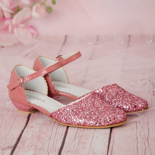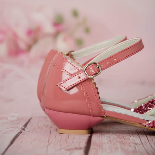 Eleganckie, zapinane, różowe buty wizytowe dla dziewczynki. Buciki dobrze wyprofilowane, dzięki czemu pewnie trzymają się stopy. Dodatkowo posiadają paseczek, dla lepszego utrzymania stopy. Model na delikatnym obcasiku o wysokości 1,5 cm. Zewnętrzna część obuwia wykonana jest ze skóry ekologicznej, natomiast wkładka ze skóry naturalnej. Różowe buty dziewczęce idealnie sprawdzą się zarówno jako przebranie w dniu Pierwszej Komunii Świętej jak i w podczas innych uroczystości i nie tylko.