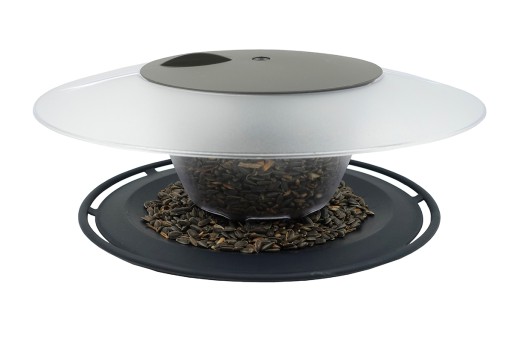 Nowoczesny karmnik dla ptaków Birdyfeed Round z dużym pojemnikiem na słonecznik i ziarno różnej wielkości.