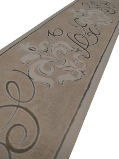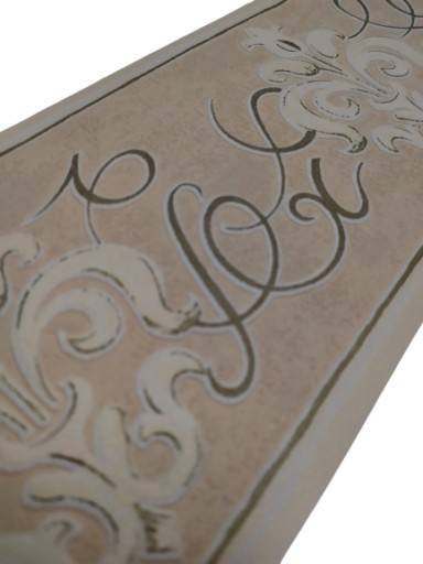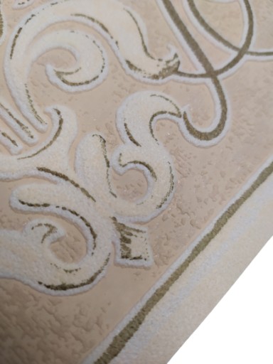 Wzór: Powtarzalne rozety-desenie barokowy w kolorze jasnego beżu, delikatnie miejscowo pozłocone. Pomiędzy rozetami wypukłe złote esy-floresy z obwódką w tym samym odcieniu beżu co rozety. Tło nakropione, wklęsłe, w odcieniu średniego beżu. Dolna i górna krawędź wykończona lekko cieniowanym paskiem w beżu jak rozety i ze złotą prążką. Kolorystyka jednorodna, stonowana, w odcieniach beżu ala kawa zbożowa, z dodatkiem starego złota. Pasek wykonano ze spienionego winylu - wzór i paski boczne są wypukłe, tło wklęsłe. Jest wodoodporny, ale mycie, ze względu na strukturę, raczej punktowe.