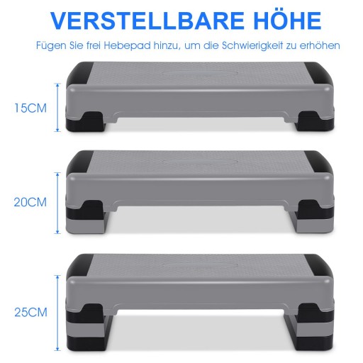 Regulowana wysokość: Trzy różne, regulowane wysokości (15, 20 i 25 cm) wspierają koordynację, siłę fizyczną i wytrzymałość. Dzięki łatwo wymiennym i zdejmowanym poziomom możesz szybko dostosować swój trening w dowolnym momencie.