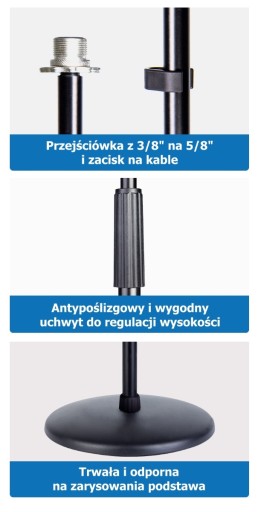 W zestawie znajdziemy przejściówke z gwintu mikrofonowego 3/8" na 5/8". Dzięki niej mamy pewność że zawsze będziemy mogli przymocować uchwyt na mikrofon niezależnie od gwintu jaki posiada.