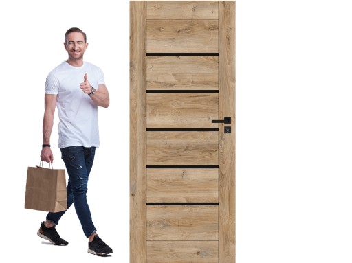drzwi ramowe MDF bezprzylgowe, 3 ukryte zawiasy, zamek magnetyczny, czarne wstawki zamiast szklenia.