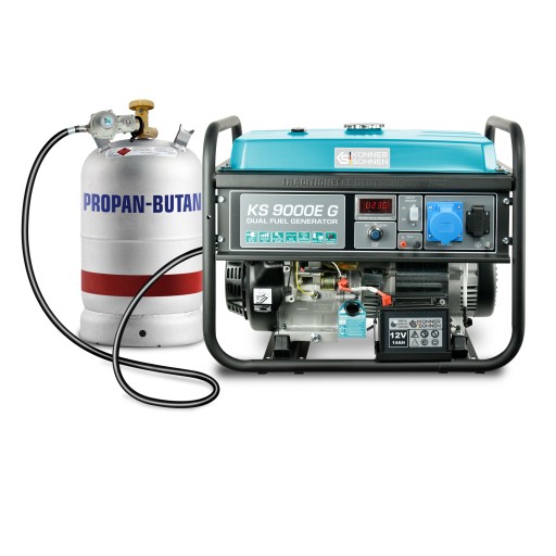 Agregat prądotwórczy gazowo-benzynowy KS 9000E G niemieckiej marki Könner&Söhnen serii DUAL FUEL (LPG / Benzyna) to dwupaliwowy model hybrydowy, który jest poszukiwany, ponieważ ma optymalne właściwości, jest wyposażony zarówno w rozruch ręczny, jak i elektrostart. Moc generatora jest wystarczająca do awaryjnego zasilania regularnie używanych urządzeń elektrycznych. Generator jest równie wydajny zarówno na benzynie, jak i na gazie (propan-butan) – parametry wytwarzanej energii elektrycznej będą takie same. Wszystko, co jest potrzebne do podłączenia butli z gazem, jest już w zestawie: