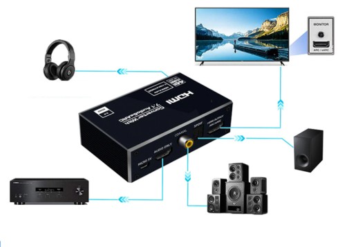 Ekstraktor dźwięku z obsługą ARC/eARC z HDMI 4K: HDMI do HDMI audio, Toslink, Coaxial oraz Jack 3,5mm