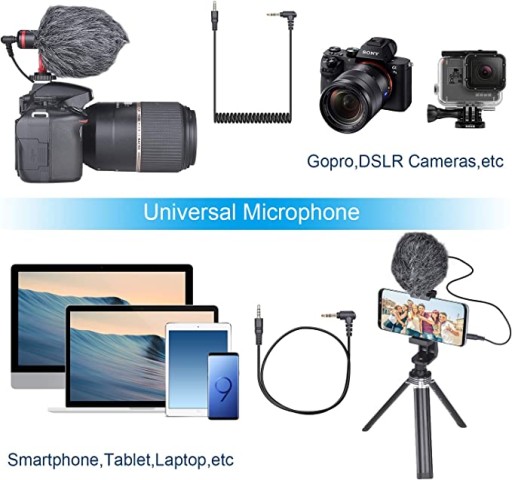 - ♫ Mikrofon Cardioidowy: z osłoną przeciwwiatrową, specjalnie zaprojektowany, aby zminimalizować hałas wiatru i inne zakłócenia oraz poprawić jakość dźwięku podczas nagrywania na zewnątrz na podstawie wbudowanych mikrofonów. Może być również stosowany na smartfonach z gniazdem 3,5 mm, kamerach Sony Nikon Canon DSLR, nagrywarkach audio, komputerów, tabletów, laptopów i innych urządzeń do nagrywania audio/wideo z portem 3,5 mm.