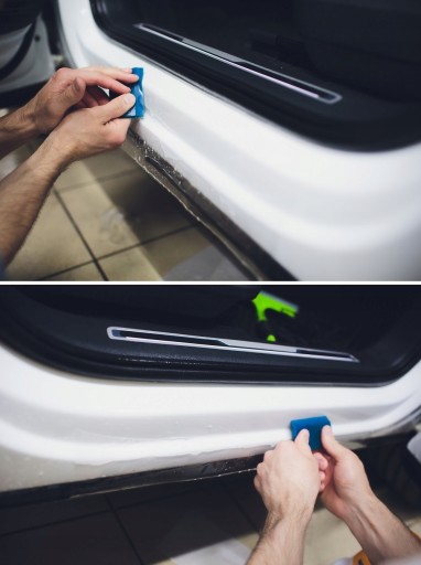 - W przypadku aplikacji na przetłoczeniach lub obłych elementach użyj opalarki lub parownicy do podgrzania folii. Folia pod wpływem wysokiej temperatury staje się bardziej plastyczna i łatwiej jest ją dopasować do wymagających elementów.