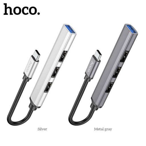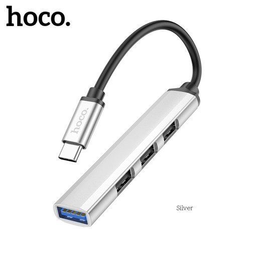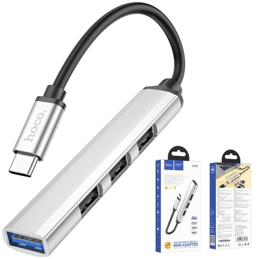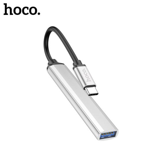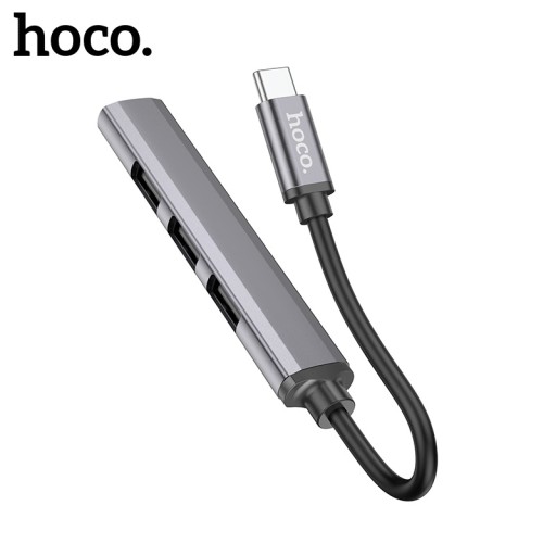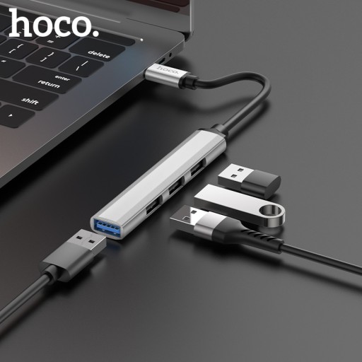 hoco. HB26 4in1 to uniwersalny hub USB, wyposażony w port wejścia w standardzie USB Type-C oraz 4 porty USB, jeden port w standardzie USB 3.0 oraz 3 porty w standardzie USB 2.0. Hub obsługuje urządzenia o pojemności maksymalnej do 1 TB.