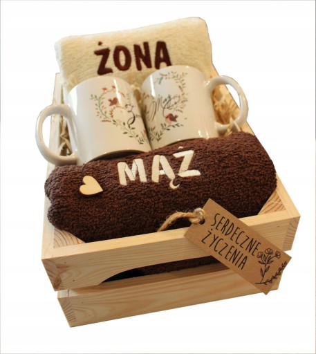 Elegancki zestaw dwóch haftowanych ręczników, dwóch kubków wraz z koszem ozdobnym