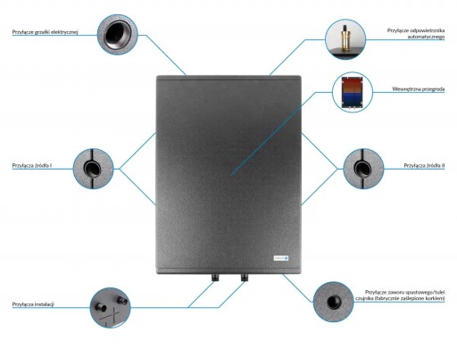 - Dedykowane przyłącza do podłączenia dwóch źródeł ciepła i grzałki elektrycznej.