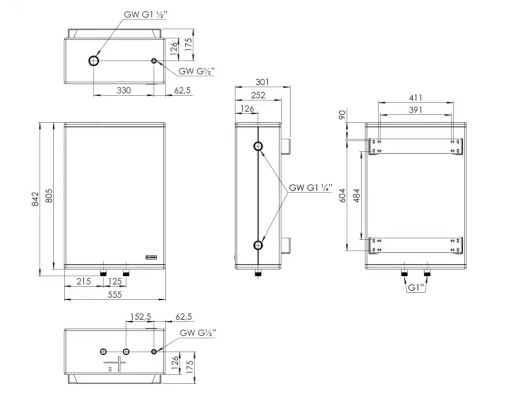 - przyłącza od strony instalacji 2x G1”, 2x półśrubunki G1½" w komplecie