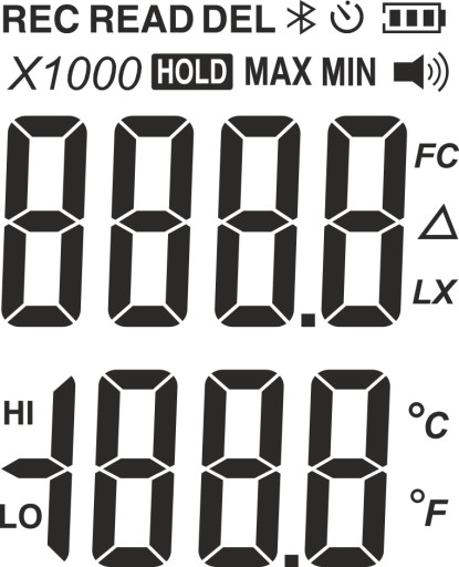 - Jednostki pomiaru oświetlenia i temperatury: Lux/℃; Lux/℉; FC/℃; FC/℉