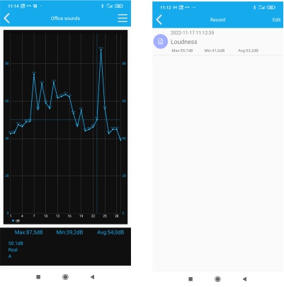 Aplikacja obrazuje na wykresie dane z rzeczywistego pomiaru dźwięku. Pozwala także na powrót do danych w późniejszym czasie oraz kasowanie zbędnych pomiarów.