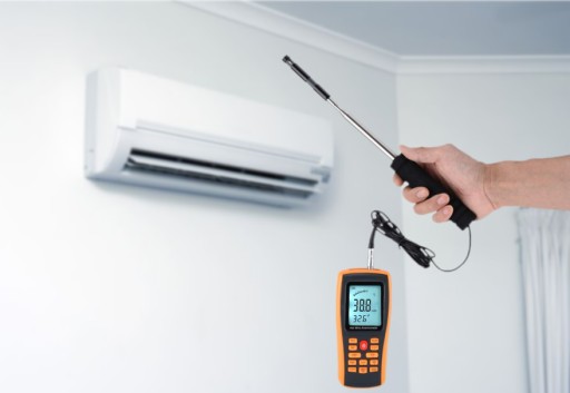 Pomiar prędkości, przepływu i temperatury powietrza z rejestratorem danych i rozsuwaną sondą pomiarową.