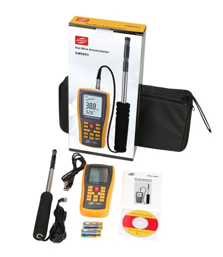Z możliwością rozkładania z 30 cm do 1m na przewodzie ułatwia pracę z urządzeniem w trudno dostępnych miejscach i daje duży zasięg całkowity. Profesjonalne urządzenie stosowane do celów przemysłowych i badawczych. Sprawdza się przy mierzeniu prędkości i temperatury powietrza w układach chłodzenia, wentylatorach komputerowych, klimatyzatorach, nadmuchach powietrza, wentylacji. Dzięki zastosowaniu sondy cieplnej pomiar jest bardzo dokładny i ma wykrywa już najmniejszy ruch powietrza.
