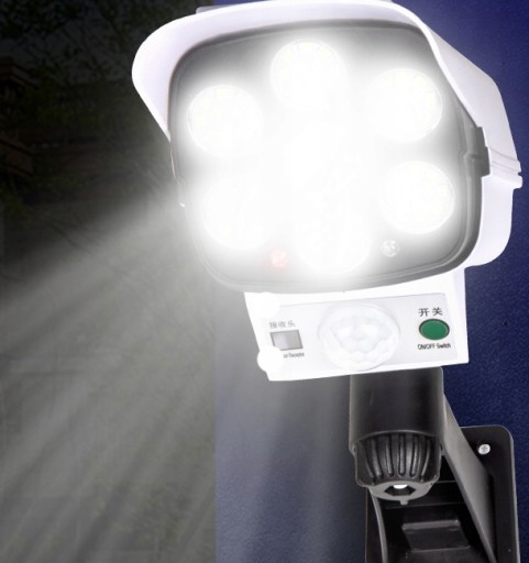 Wysokiej jakości atrapa kamery to urządzenie zasilane z panelu słonecznego co gwarantuje oświetlenie bez dodatkowego źródła zasilania. Wyposażona została w bardzo jasny panel 77 punktów LED COB o mocnym strumieniu światła.