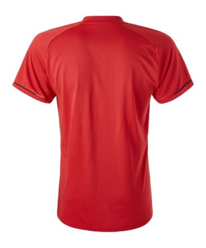 Koszulka o regularnym kroju uszyta z elastycznego, poliestru, który jest łatwy w praniu i szybkoschnący. Technologia Deep Dry Tech oraz meshowa struktura materiału zwiększają cyrkulację powietrza. Płaskie szwy nie uwierają i chronią przed otarciami i podrażnieniami skóry. Krótkie rękawy nie ograniczają ruchów. Mankiety przy rękawach wzmocnione tasmą zwiększają komfort. Delikatna stójka pod szyją z zapięciem na dwa zatrzaski dla większej wygody. Na karku wzmocnienie taśmą. Kontrastowe wstawki oraz logo firmy.