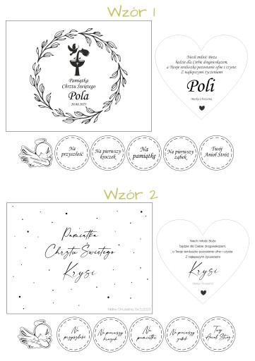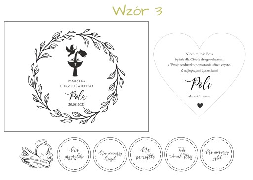 Po zakupie prosimy o podanie imienia dziecka, PODPISU OD KOGO jest prezent oraz wzoru (jeśli nie zostanie podany, wykonamy wzór 3). Imiona na wierzchu pudełka grawerujemy w takiej formie, w jakiej zostaną nam przesłane - jeśli otrzymamy informację "imię dziecka Krzyś" - na pudełku pojawi się napis "Pamiątka Chrztu Świętego Krzyś". Na serduszku natomiast odmieniamy imię w celowniku (Komu? - Krzysiowi). Prosimy więc o dokładne sprawdzenie treści wysyłanych do nas wiadomości, gdyż reklamacji z powodu złej odmiany NIE przyjmujemy.
