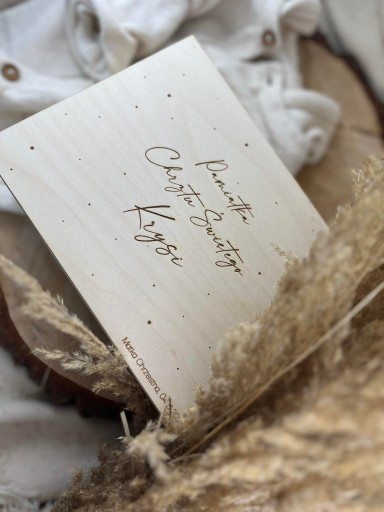 Pudełko z zewnątrz posiada spersonalizowany grawer oraz tabliczkę z życzeniami i podpisem.